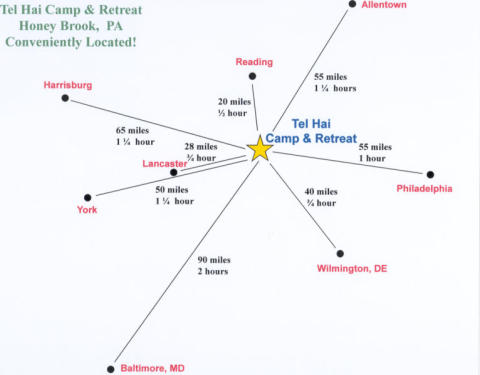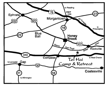 Tel Hai Camp and Retreat is located South Eastern Pennsylvania in Chester County just 3 miles south of Honey Brook. We are 1.5 miles east of Route 10 on Beaver Dam Road surrounded by beautiful countryside. Take Exit 298 Morgantown from the PA Turnpike.
