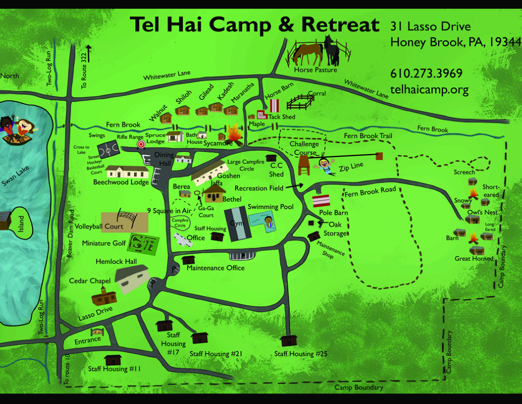 Tel Hai Camp & Retreat is situated on a one hundred acre facility consisting of rolling hills, wooded areas, open fields, and a beautiful seven-acre lake. The following map outlines our facilities and grounds layout.